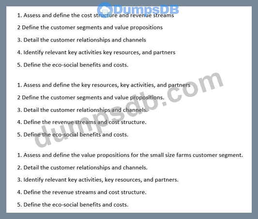 Green Elk & Company is the world's leading manufacturer of agricultural and forestry machinery. The former company slogan "Elk always runs" has recently been changed to "Elk feeds the world". One of Green Elk's strategic goals is to increase its revenue in the emerging markets of China, India, and other parts of Asia by 80 % within three years. This requires a new business model that caters to significantly smaller farms with limited budgets. You are the Chief Enterprise Architect and the CIO asks you to assess the now business model for smaller farms with smaller budgets. By applying the Sustainable Business Model Canvas, which sequence of steps is best practice?