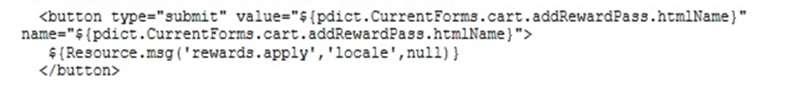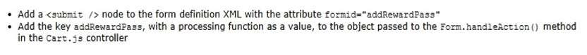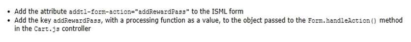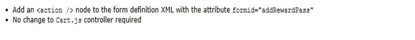 A Digital Developer needs to add a new form to the shopping cart page to allow customers to enter their rewards pass ID. There is already an existing Cart.jscontroller that handles processing of the other cart forms. In addition, a form field node is in the form XML and the necessary form input is present in the ISML template.