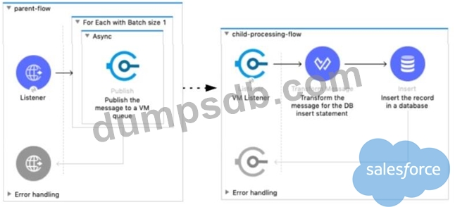 A Mule 4 application has a parent flow that breaks up a JSON array payload into 200 separate items, then sends each item one at a time inside an Async scope to a VM queue.