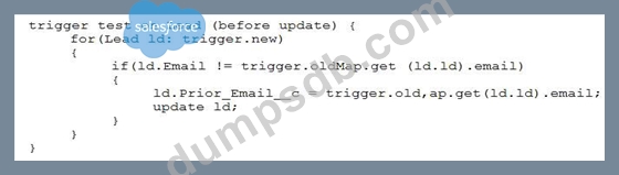 A lead object has a custom field Prior_Email__c. The following trigger is intended to copy the current Email into the Prior_Email__c field any time the Email field is changed: