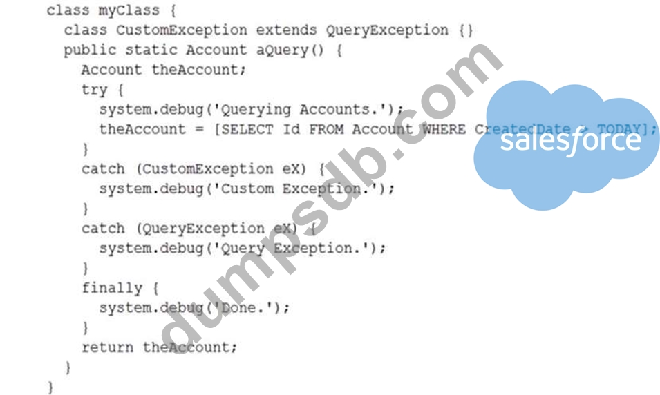 What will be the output in the debug log in the event of a QueryExeption during a call to the @query method in the following Example?