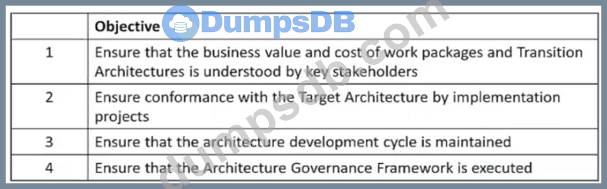 According to the TOGAF Standard, Version 9.2, the ADM phases and their objectives are as follows1: Preliminary Phase: To prepare and initiate the architecture development cycle, including defining the architecture framework, principles, and governance. Phase A: Architecture Vision: To define the scope, vision, and stakeholders of the architecture initiative, and to obtain approval to proceed. Phase B: Business Architecture: To describe the baseline and target business architecture, and to identify the gaps between them. Phase C: Information Systems Architectures: To describe the baseline and target data and application architectures, and to identify the gaps between them. Phase D: Technology Architecture: To describe the baseline and target technology architecture, and to identify the gaps between them. Phase E: Opportunities and Solutions: To identify and evaluate the opportunities and solutions for implementing the target architecture, and to define the work packages and transition architectures. Phase F: Migration Planning: To finalize the implementation and migration plan, and to ensure alignment with the enterprise portfolio and project management. Phase G: Implementation Governance: To provide architecture oversight and guidance for the implementation projects, and to manage any architecture change requests. Phase H: Architecture Change Management: To monitor the changes in the business and technology environment, and to assess the impact and performance of the architecture. Requirements Management: To manage the architecture requirements throughout the ADM cycle, and to ensure alignment with the business requirements. Based on the above definitions, we can match each objective with the corresponding phase as follows: Objective 1: Ensure that the business value and cost of work packages and transition architectures is understood by key stakeholders. This objective is achieved in Phase H: Architecture Change Management, where the value realization and cost-benefit analysis of the architecture are performed2. Objective 2: Ensure conformance with the Target Architecture by implementation projects. This objective is achieved in Phase F: Migration Planning, where the conformance requirements and criteria for the implementation projects are defined3. Objective 3: Ensure that the architecture development cycle is maintained. This objective is achieved in Phase F: Migration Planning, where the architecture roadmap and iteration cycle are maintained3. Objective 4: Ensure that the Architecture Governance Framework is executed. This objective is achieved in Phase G: Implementation Governance, where the architecture governance processes and procedures are applied to the implementation projects4. Reference: 1: The TOGAF Standard, Version 9.2, Chapter 5: Architecture Development Method (ADM) 2: The TOGAF Standard, Version 9.2, Chapter 21: Architecture Change Management 3: The TOGAF Standard, Version 9.2, Chapter 20: Migration Planning 4: The TOGAF Standard, Version 9.2, Chapter 19: Implementation Governance