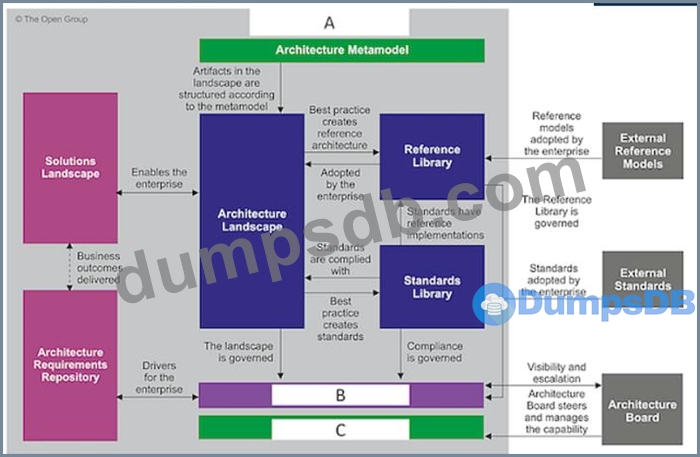 * A-Architecture Repository: This is a part of the Architecture Metamodel that contains artifacts structured according to the metamodel. It includes the Architecture Landscape which is adopted by the enterprise and governed by certain standards and practices. * B-Governing Board: The Governing Board ensures visibility and escalation, meaning it oversees and manages the capability of the architecture landscape. It plays a crucial role in governance. * C-Enterprise Capability: This refers to how well an enterprise can execute its mission, meet business objectives or satisfy its stakeholders' needs and expectations. It's influenced by both internal factors (like resources, processes) and external ones (like market trends).